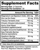 Powered by magnesium, zinc, tribulus terrestris, longjack, horny goat weed, chrysin, saw palmetto, hawthorn, and cissus quadrangularis, this formula supports muscle development, cardiovascular health, libido, and hormonal balance.